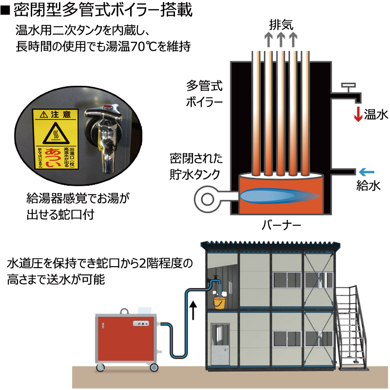 密閉型多管式ボイラーで温度上昇が早く、約4分で
