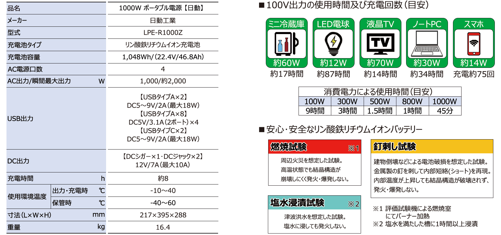 各種保護機能付(過負荷・短絡・過充電・過放電・温度)。
